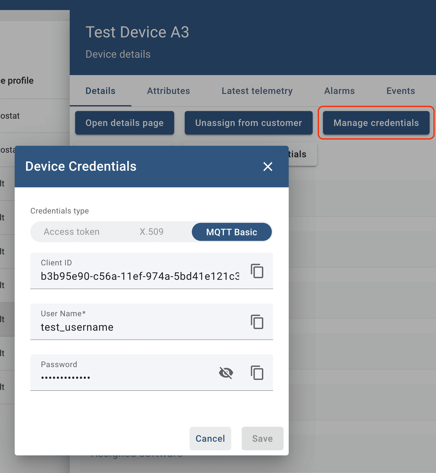 - Set up the MQTT credentials. Username and password can be as you like, the MQTT Client ID has to be the same as the Thingsboard client ID.