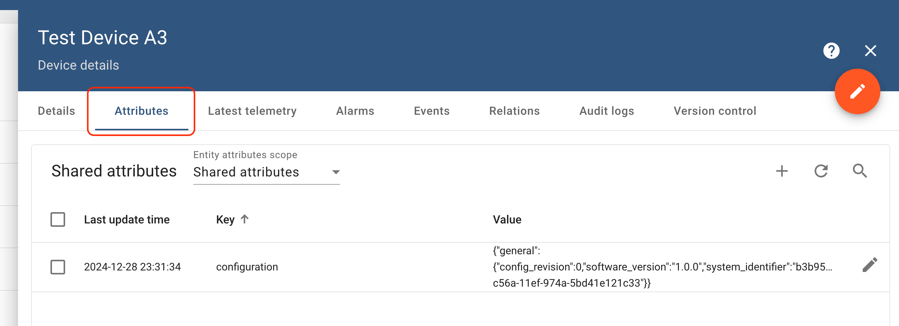 You can publish new configurations with Thingsboard using "shared attributes" using the attribute name "configuration". Here, you have to keep track of the revision number yourself – as opposed to Tenta. Whenever you update the configuration here, the respective client will receive it. It will only update to configurations with a higher revision number.